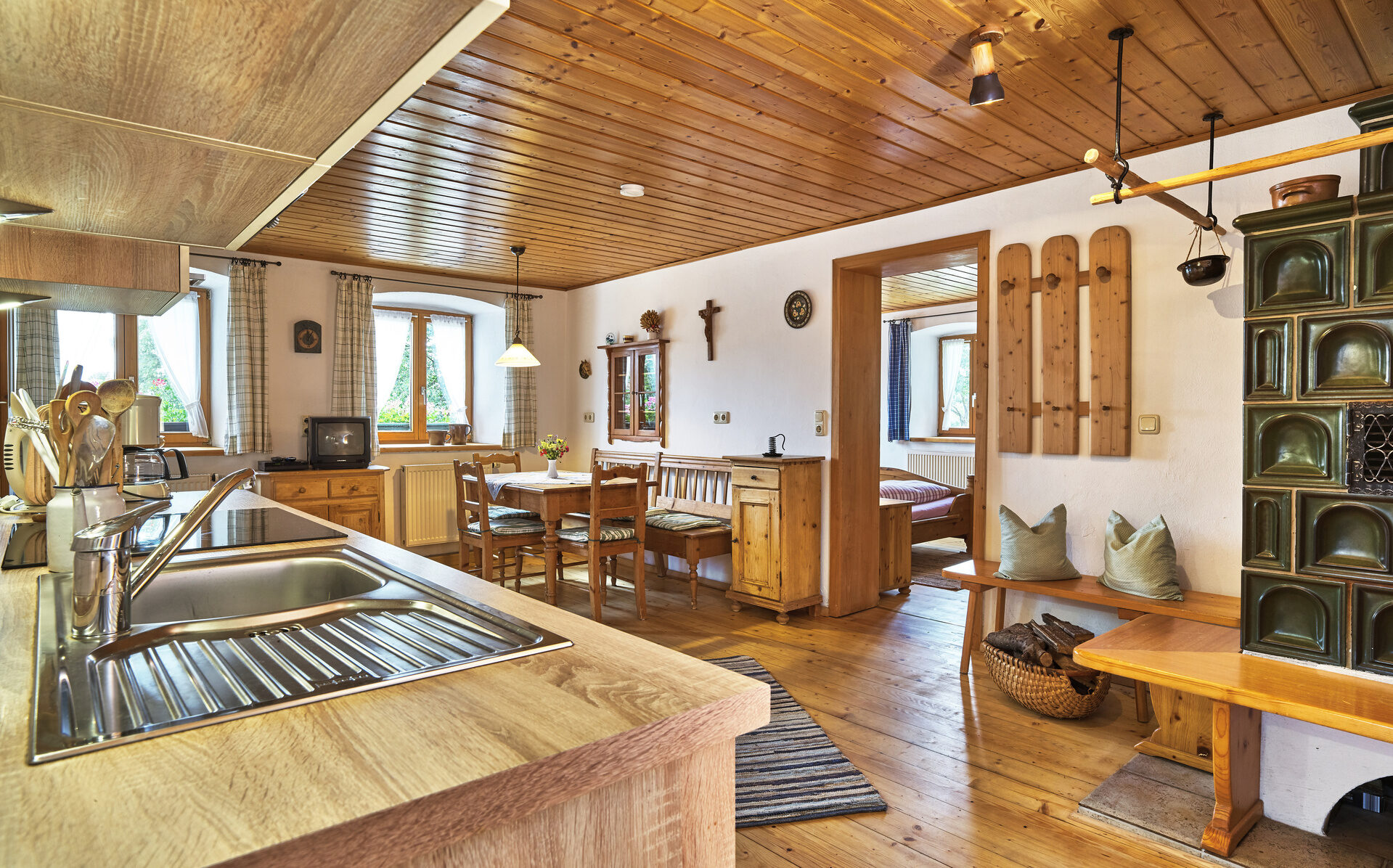 In der Ferienwohnung des Pfefferhofs verbindet sich ein gemütlicher Essbereich aus Holz mit einer modernen Küche.