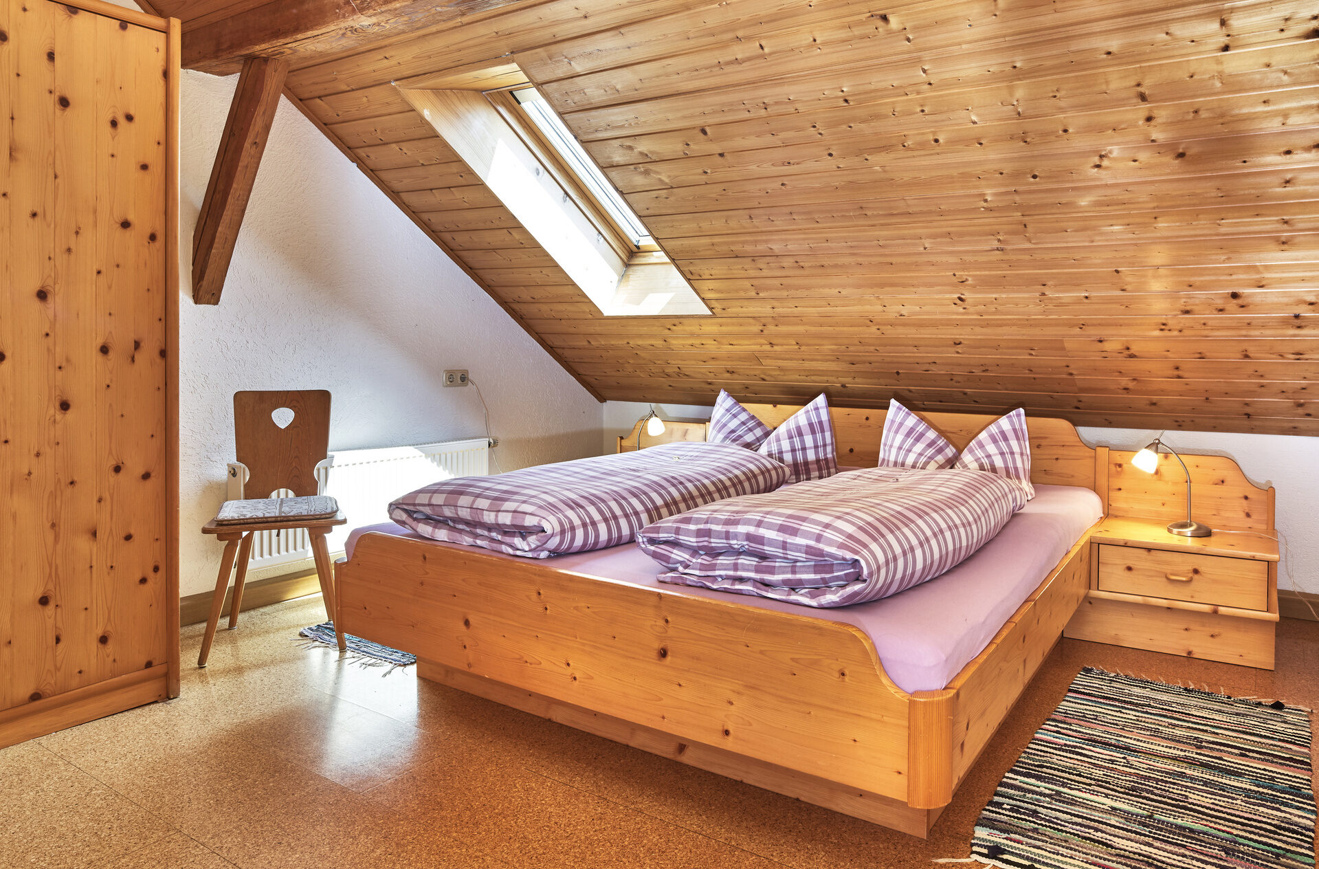 Ein gemütliches Bett steht in dem holzverkleideten Schlafzimmer ,in einer der Ferienwohnungen, auf dem Pfefferhof.